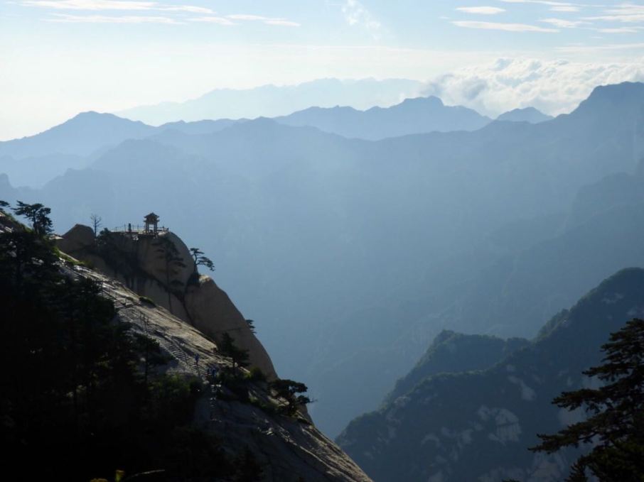 After what felt like a lifetime, I arrived in Shenzhen, walked over the border to Hong Kong and although feeling a strong attraction to it, I decided to leave it for another time to save money. Within an hour I was back in Shenzhen at midnight. I searched for some hostels and finding none I wondered the city eating a bag of garlic flavoured monkey nuts until 2am when fatigue finally forced sleep upon me on the concrete outside the train station I had just come from, so I slept cuddling my backpack for four hours waking up with the sun, feeling much more spritely than I expected. To McDonald’s I went for the free WiFi, and proudly managed to resist the coffee and the bacon and egg McMuffin. There I booked a return train ticket for the next morning, this one was 30 hours, but… I had a seat. I then hunted for a hostel again, not tough enough for another night on the concrete outside the train station. I soon found one and could finally relax. After 30 sleepless hours, I was back in Xi’an, where I stayed with Bernd for a couple more days and then continued on towards the coast and the end of China! I felt excited to start a new chapter in the journey in South Korea but I had another 1200km of hot humid weather and busy, dusty, smoggy roads to contend with. Although, there was also beautiful scenery and a special mountain, Hua Shān. Sitting just a day’s ride from Xi’an, Hua Shān is a 2200m high sacred misty mountain, consisting of four main peaks. With Hua Shān village starting at 400m, it’s nearly 2km of height gain up a steep, sometimes almost vertical, 12km trail.