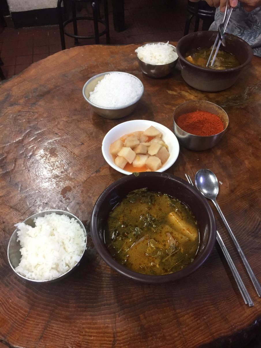 The restaurant served only one meal, spicy beef soup with a bowl of rice and a bowl of the simplest Kimchi. For those who don’t know, Kimchi is fermented vegetables, there are 180 different types of Kimchi, the most common being the baechu kimchi using napa cabbage as a base. I couldn’t get enough of it. Kimchi often contains many different ingredients, you have the base vegetable such as cabbage but it could also be radish or sesame leaves, cucumber, aubergine, courgette and many more. After the cabbage is soaked overnight in brine to kill any pathogenic bacteria it’s drained and a mixture of sub ingredients is added. This includes chilli flakes, red pepper powder, garlic, ginger, shrimp, sesame seeds, mustard leaves, salt, rice starch and vinegar. All these ingredients and the end product are incredibly good for you.