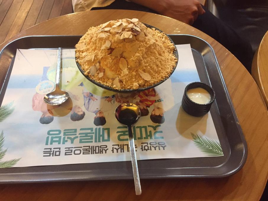 After this vast meal Felix said I had to try a traditional Korean pudding so we went to a cafe and had (blabla) which consists of frozen milk which is then shaved to a fine powder of basically milk snow… this is piled up and then covered in bean powder which tastes a little like powdered marzipan and nuts.